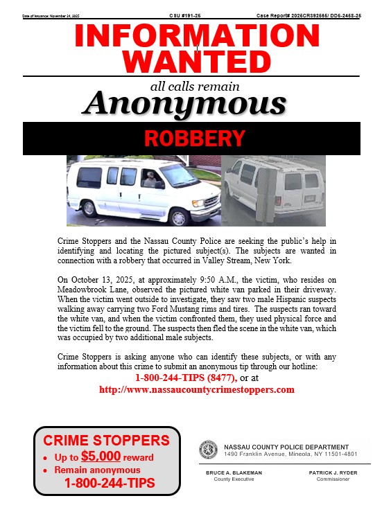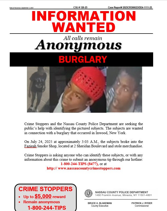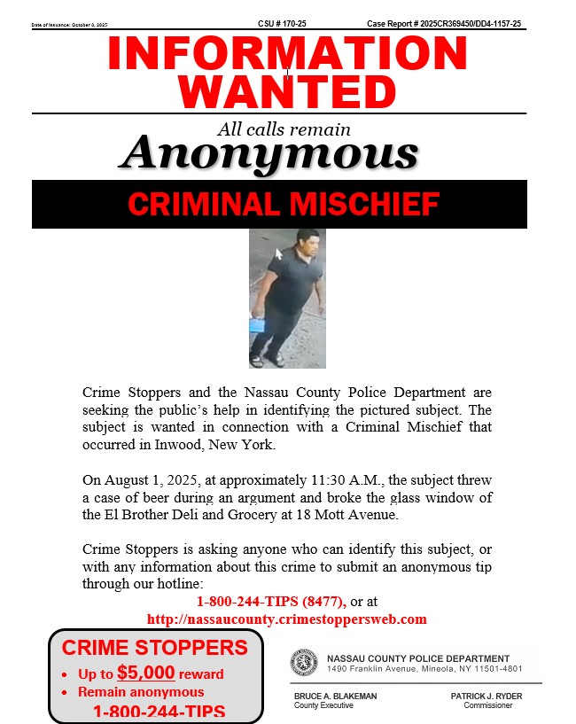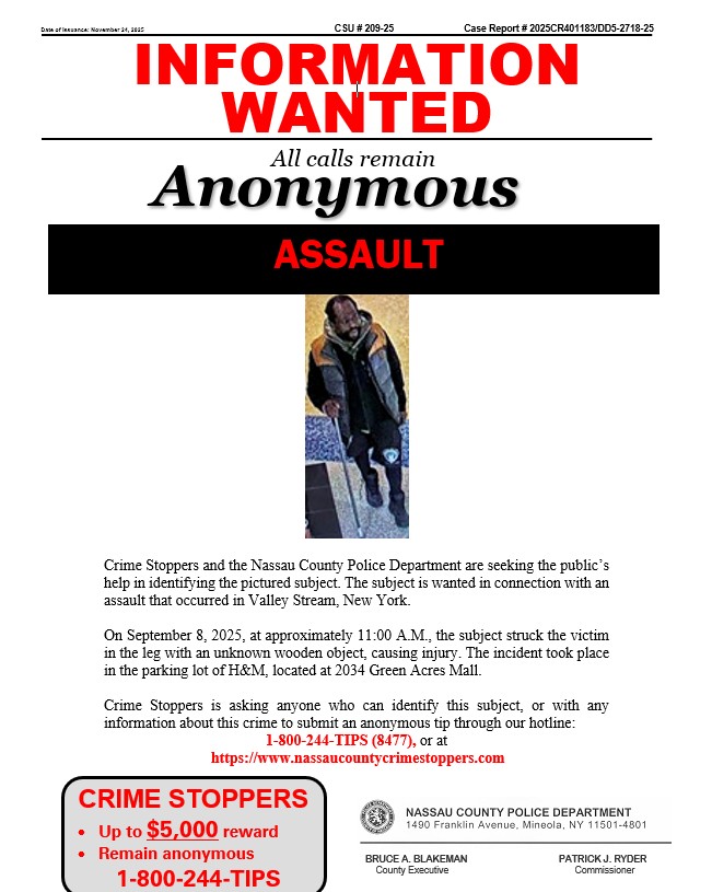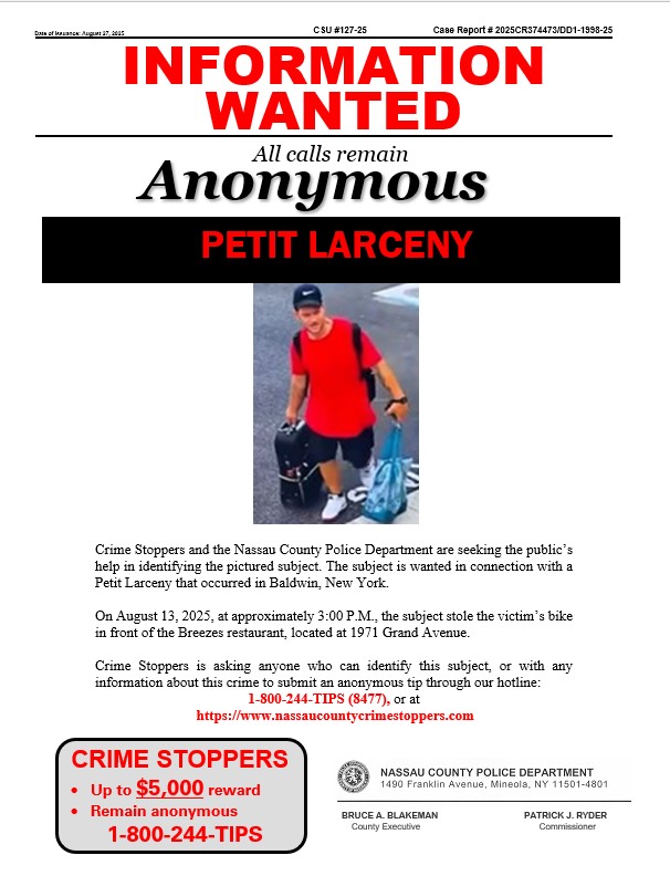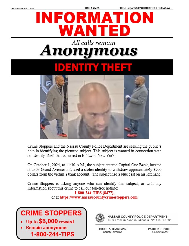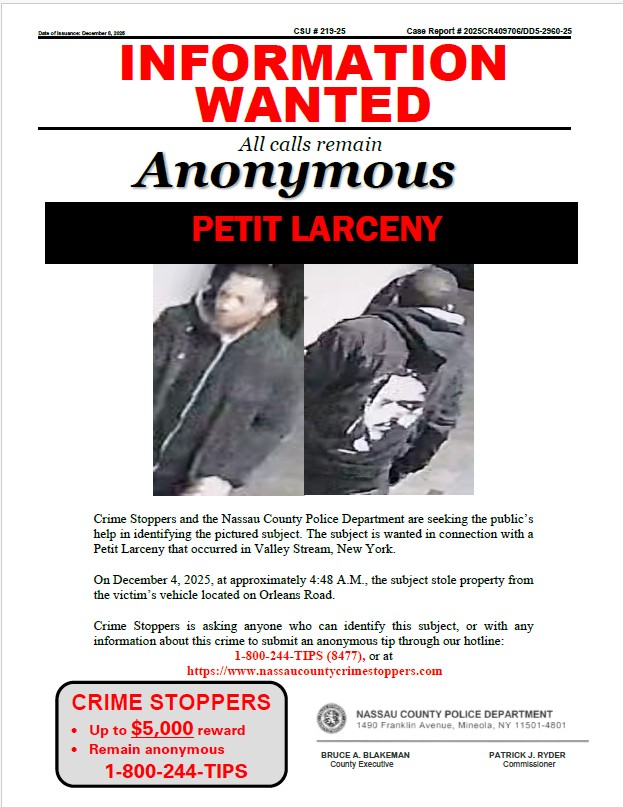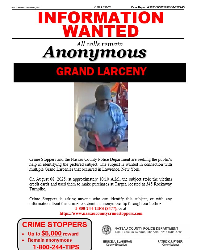 Crime Stoppers and the Nassau County Police Department are seeking the public’s help in identifying the pictured subject. The subject is wanted in connection with a Grand Larceny that occurred in Elmont, New York.